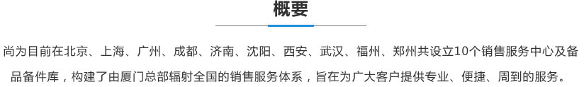 尚為目前在北京、上海、廣州、成都、濟(jì)南、沈陽、西安、武漢、福州、鄭州共設(shè)立10個銷售服務(wù)中心及備品備件庫,構(gòu)建了由廈門總部輻射全國的銷售服務(wù)體系,旨在為廣大客戶提供專業(yè)、便捷、周到的服務(wù)。