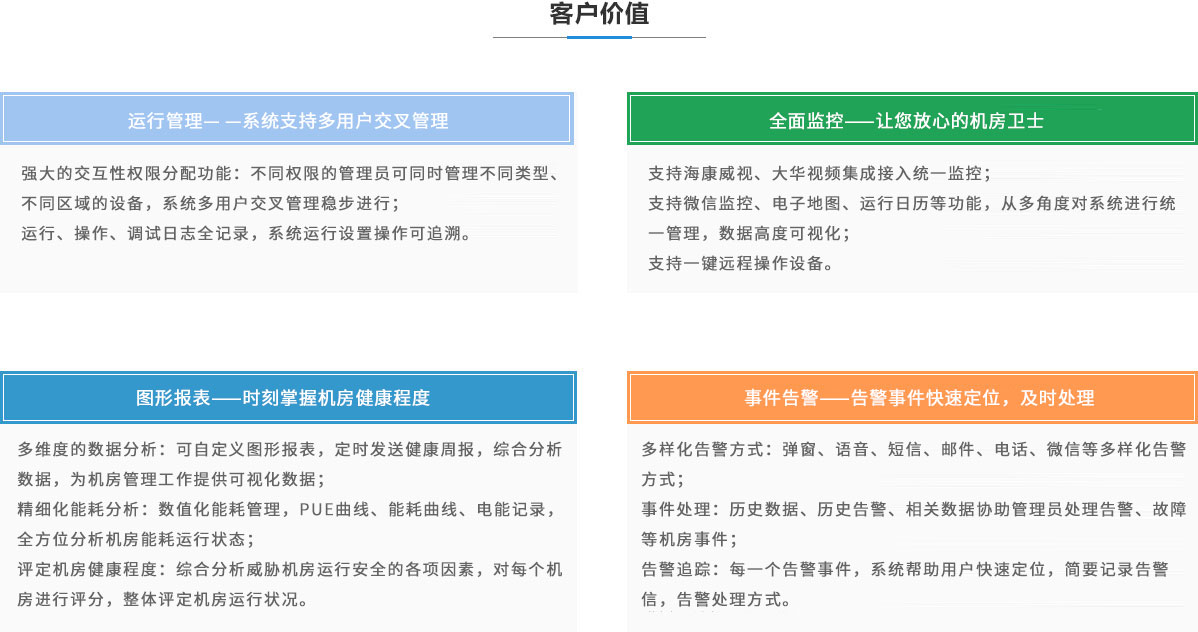 全面監控——讓您放心的機房衛士 多樣化告警方式:彈窗、語音、短信、郵件、電話、微信等多 樣化告警方式; 事件處理:歷史數據、歷史告警、相關數據協助管理員處理告 警、故障等機房事件; 告警追蹤:每一個告警事件,系統幫助用戶快速定位,簡要記 錄告警信,告警處理方式。 |